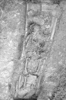 is, with tiles arranged to form a gabled roof. The skeleton is lying on